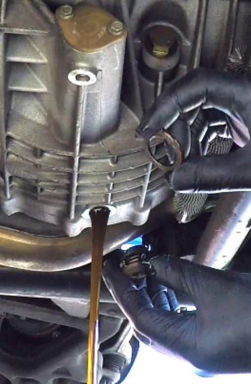 Place your drain pan under the differential drain plug. Use the 14mm Hex socket on a breaker bar and loosen the plug. Undo the plug the rest of the way with your fingers and remove it (being careful to get the copper sealing washer too). About 1.6 litres of old fluid will come out. It’s normal that the fluid is dark to black in color, that’s why you are changing it. Plan to let the oil drain and dribble out for at least 15 minutes, ideally it should have slowed to a drip before you start the refill process.
