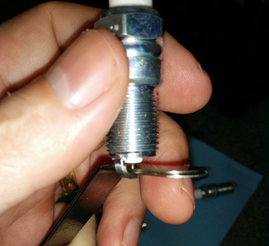 - NOTE: Be super careful to NOT bang the tip of the Spark Plug while doing this. If you accidentally to, lift the plug back out and recheck the gap. Better safe than sorry (and it will be a lot of work to get back to the plug later if you find the car isn’t running right after).
