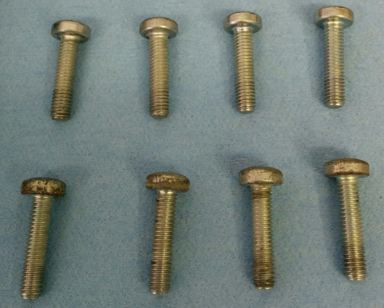 If your bolts are looking tatty (the finish is dulled or corroded) you can splurge and get a replacement set of Aston Martin p/n 702847. You can find them for just $0.35 USD ea. online or for about the same from Rob Sims at HWM in England. For about $3 USD you can have a new set of 8.