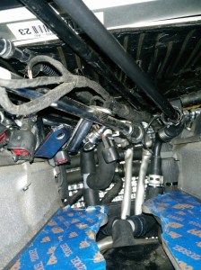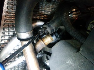 There are two other hose connections and a tie-wrap/zip-tie we need to disconnect before we can wriggle the whole assembly out of the engine bay.