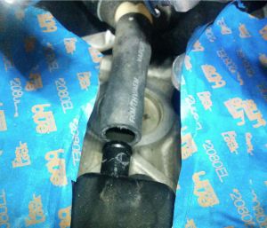 - It has an Oetiker clamp, and if you happen to know how to release it, go for it. I didn’t, so I used a pair of side cutters and snipped the metal clamp off. Make SURE you are cutting off the clamp on the correct hose. See my photo.