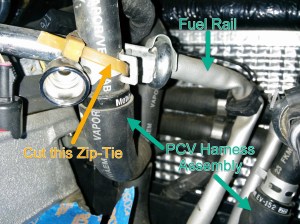 Zip-tie linking the Fuel Rail to the PCV Valve Harness Assembly In my car the right hand bank PCV valve harness assembly was zip-tied to the fuel rail. Definitely see the photo here, and take a few of your own so you can put it back the same way later. The factor also cleverly laced the zip-tie through the spring clamp, so pay attention. We need to cut this zip-tie to free the assembly.