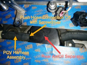 Disconnect the PCV harness assembly from the rear air/oil separator canister. In the V notch of the engine you will see the two air/oil separators, a front and a rear. The harness assembly has a black hose connecting to the rearmost connection of the rear separator. There is NO clamp, it just pushes on. I found it was easy to disconnect by just using a flat blade screwdriver to pryse and push the hose rearward and off.