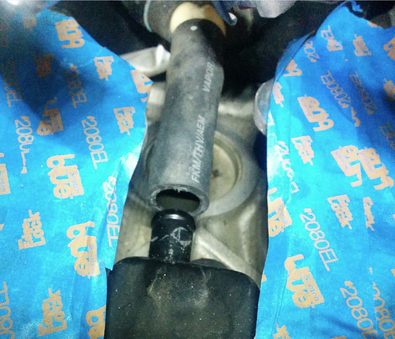 - It has an Oetiker clamp, and if you happen to know how to release it, go for it. I didn’t, so I used a pair of side cutters and snipped the metal clamp off. Make SURE you are cutting off the clamp on the correct hose. See my photo.