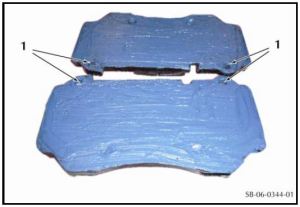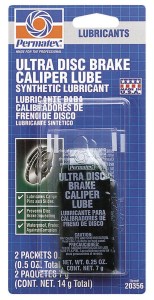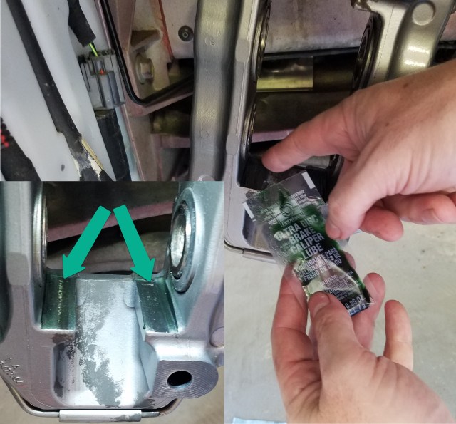 • In preparation for inserting the new brake pads apply some high temperature specialty brake grease (not regular grease!) to the slide rail surface of the caliper and guide pins.  We want the pads to be able to slide easily on the pins and caliper contact surface.