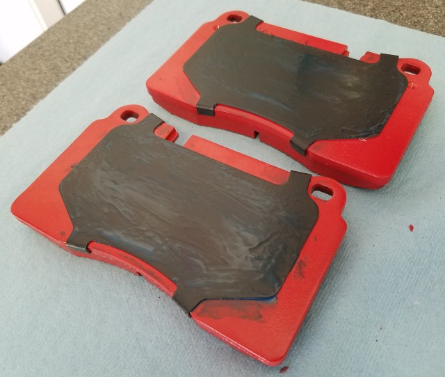 • Coat with anti-squeal shims with anti-squeal brake paste.   Aston Martin’s Service Bulletin SB-06-0344V2 recommends to slather the whole rear face, edges and retaining pin holes.  Personally I think its only necessary to coat the area where the pad contacts the piston cups.  The purpose of the paste is to act like a rubber buffer, so applying it elsewhere serves no purpose.  The piston cups press on the shim, so if you just coat the entire back of the shim you can be assured you have it done right.