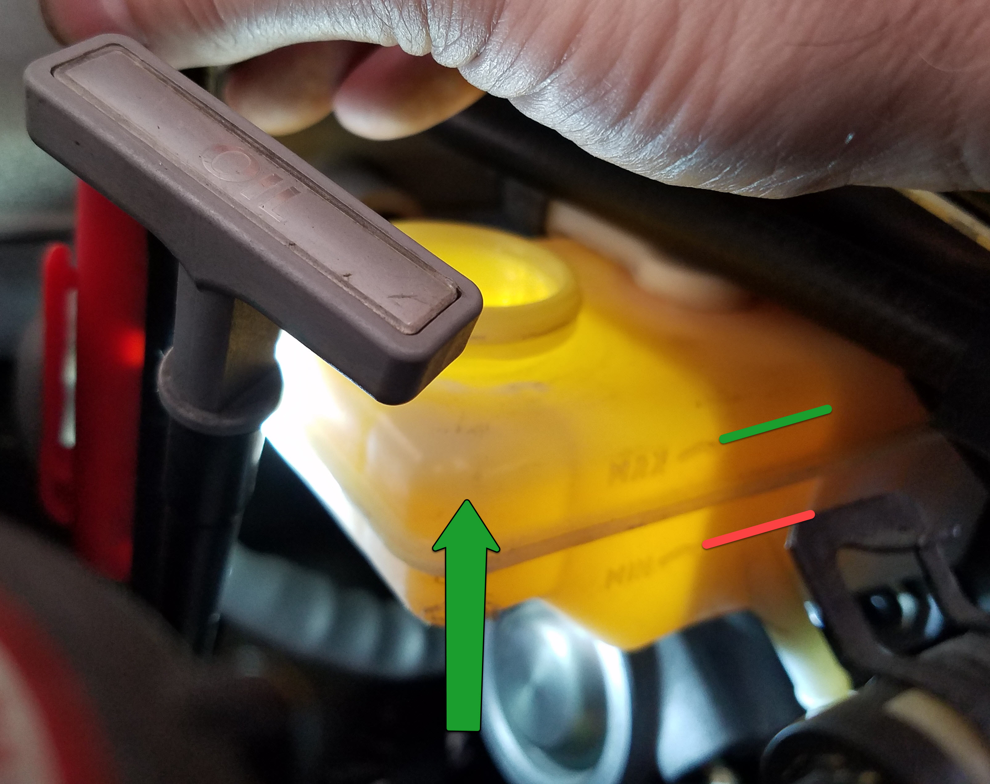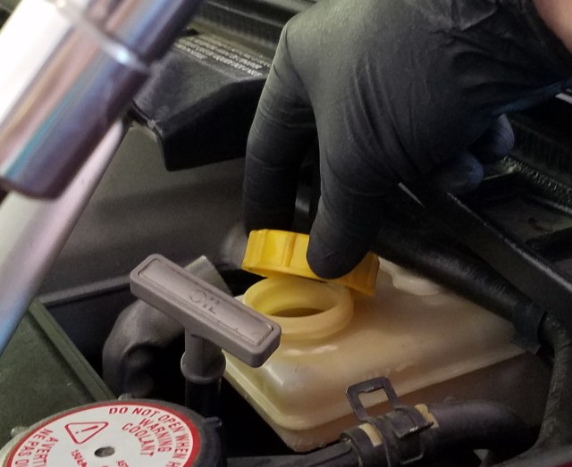 • If the level is close to overflowing, use your turkey baster (or similar device) to suck some of the fluid out of the reservoir.