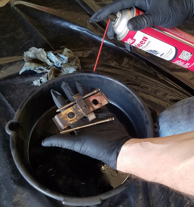 • Use a combination of your shop rags and brake clean aerosol to wash up the caliper surfaces, the two guide pins and spring clip.