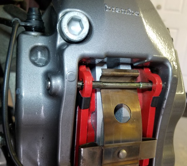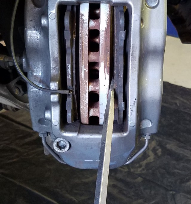 • Check that your Caliper Pistons are still fully compressed.  They need to be pushed in completely flush to the Caliper face.  If they still need to go in a little further, you can fiddle around and lever them with a large screwdriver, or perhaps use a large pair of pliers and carefully squeeze them in (protect the caliper paint from the pliers with a rag, etc.).  The pistons should move easily, but you might have to play a bit of ‘whack a mole’ as you squeeze in on piston, another might come out a bit.  Keep at it until all four pistons are fully flush.