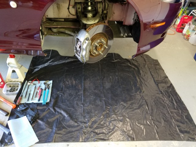 • Optional – you might want to lay down some protection on the garage floor.  Brake dust, overspray from the brake cleaner, general debris that will drop out.  I’ve found brake dust is like carbon and is tough to wipe off the floor (if you care).   My solution is to take a large yard waste plastic garbage bag and split it at the seams and lay it down like a drop cloth. Cheap and easy to toss at the end.