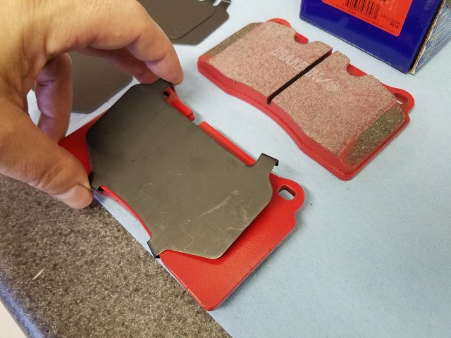 • Fit the anti-squeal shims to the pads.  If your new pads came with new ones, great, use them.  If not, transfer the shims from your old pads (just be sure to clean them and make sure they fit snug).