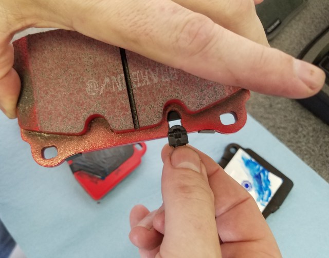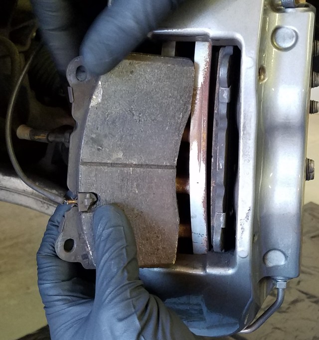 • I’ve had trouble with aftermarket pads (like the Porterfield and EBC brands) properly fitting with the brake wear sensors.  Generally the slots have been fractionally too small for the sensor, and have needed some fettling with a flat file first to remove any burrs or excess paint for the sensor to slot in properly.   It is MUCH EASIER to do a test fit of this before you apply any anti-squeal compound to the pads (they get gooey).   If you have a spare wear sensor, you can do this on the work bench.  If not, just take one of the pads over to the car and try it with the sensor in place.  Adjust as needed.  Remember you only need to do this for one pad that will be the INNER pad, the outer doesn’t get a sensor.