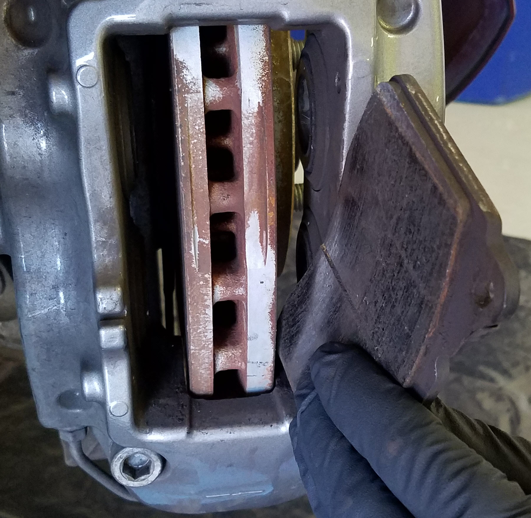 • With the pads removed we now have better access to the surfaces inside the caliper body.  The pads ‘slide’ along a surface of the caliper, and brake dust and road grime can combine to gunk this up making it difficult for the pads to slide properly.