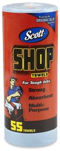 • I am fond of the hearty blue Scott Brand shop towel rolls.  These towels hold together wiping up grease and grime.  You get 55 sheets to a roll.  You can pick up a dozen rolls from Amazon.com for about $30 USD.