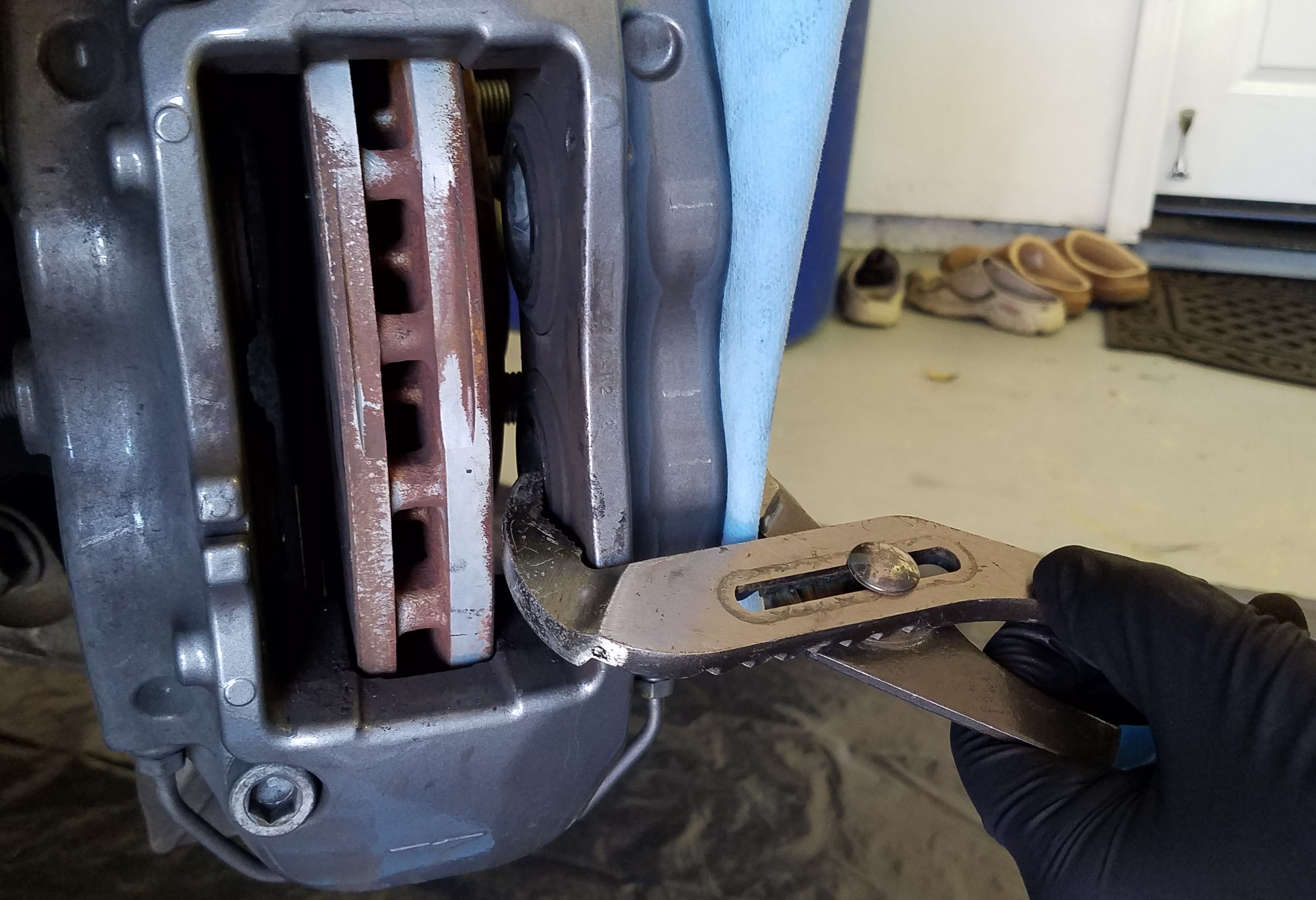 Using Pliers to carefully compress the Caliper Pistons