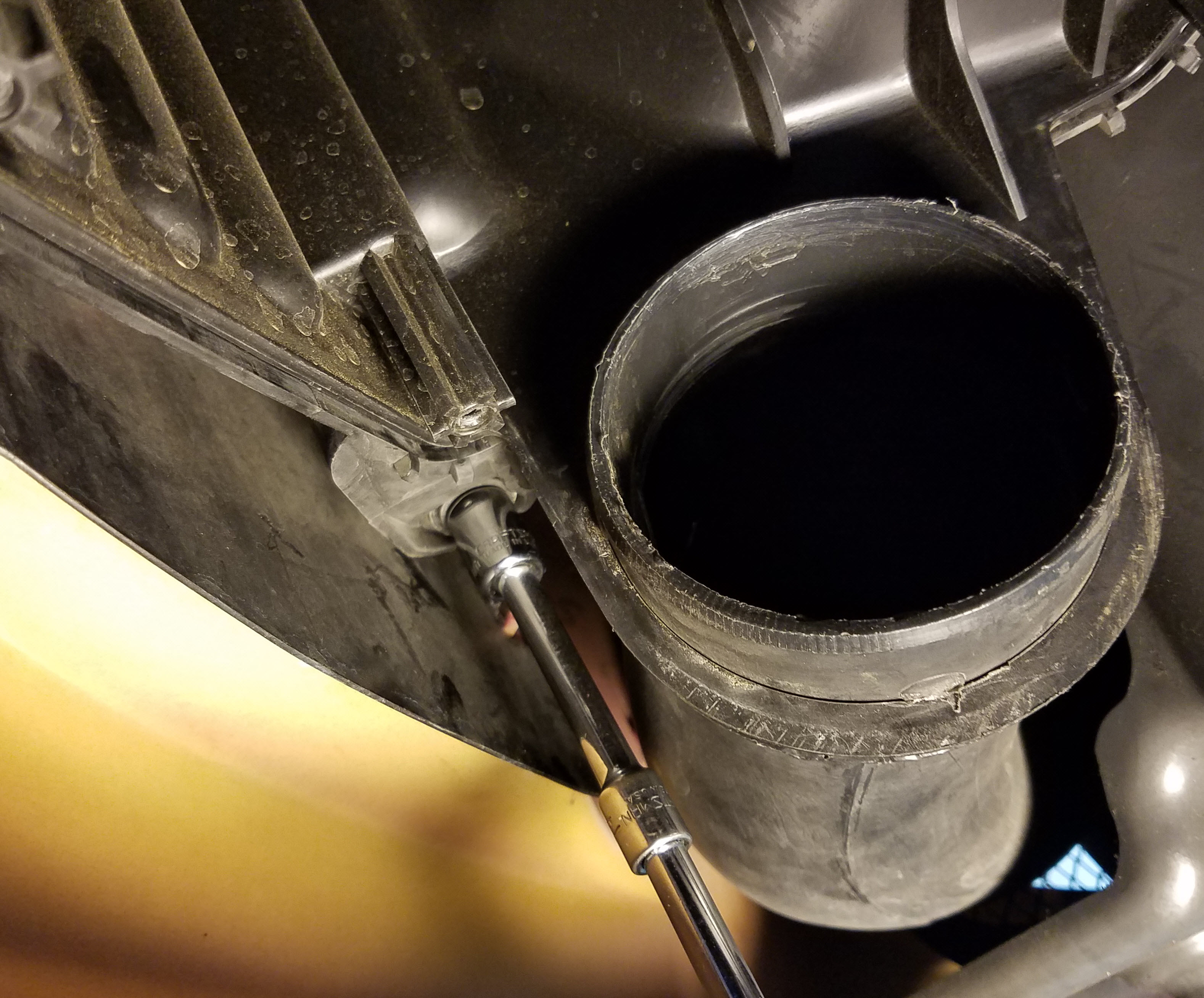 - Use the T25 torx bit and remove the lock bolt that connects the top of the airbox to the air outlet pipe.