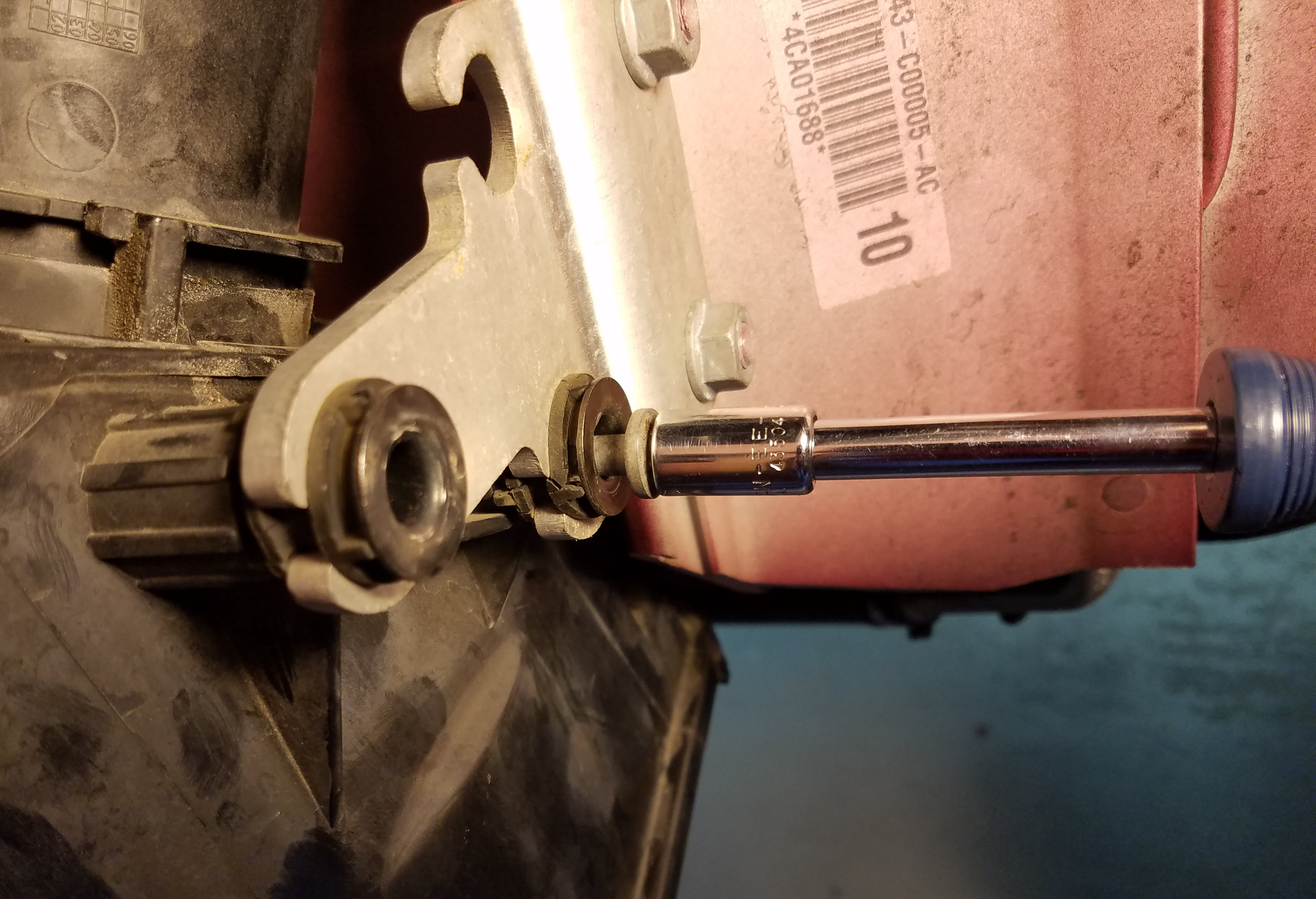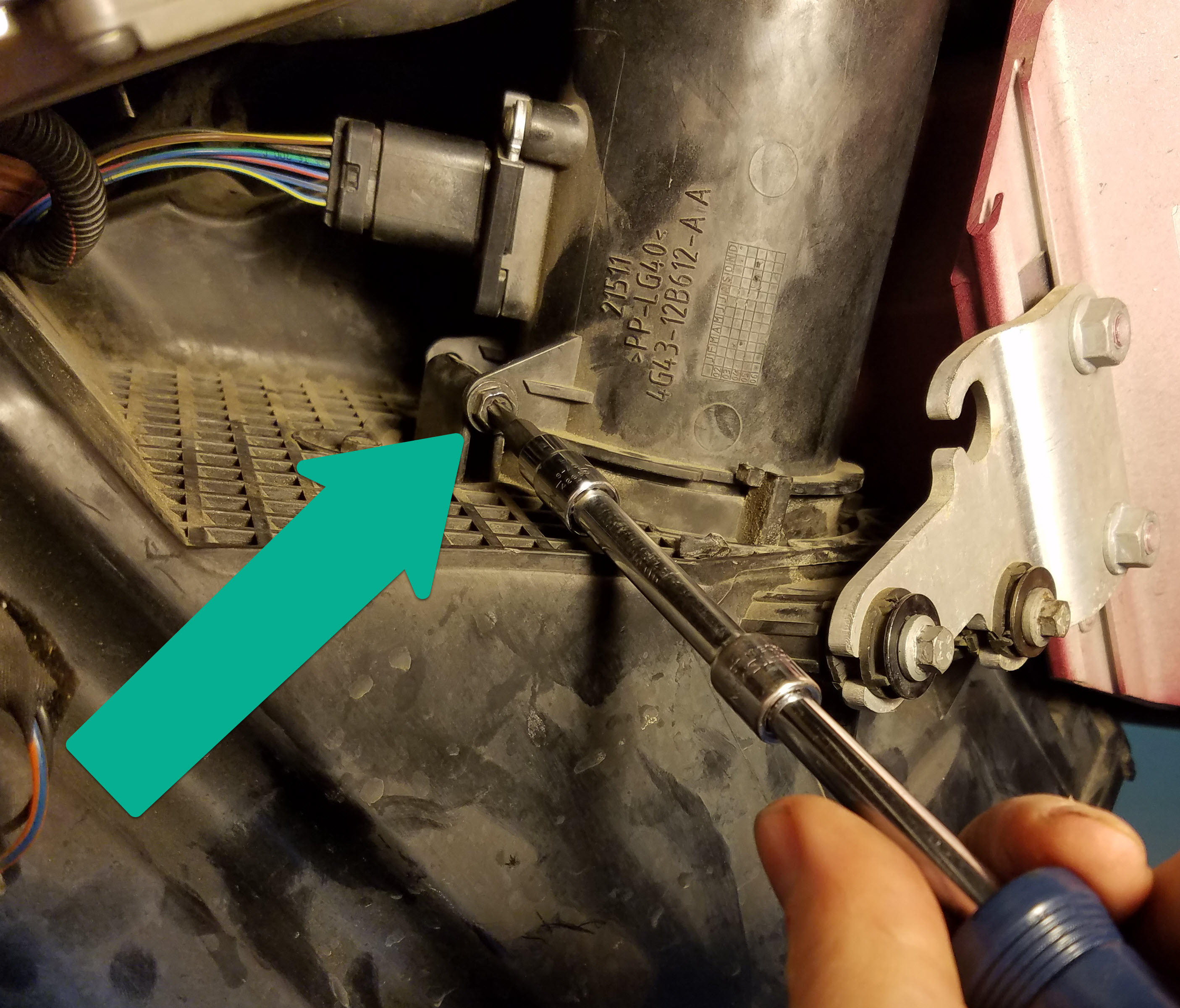- Lying under the car looking up, use your 10mm socket to remove the one airbox housing mounting bolt at the front.