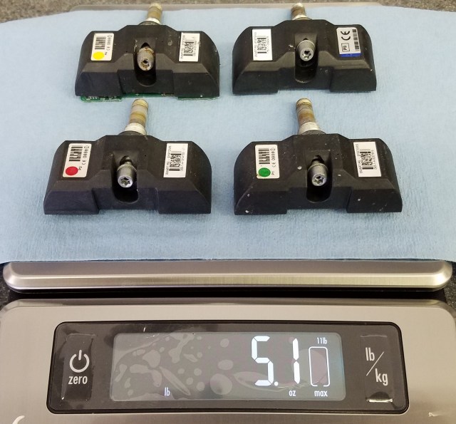 I just moved the TPMS sensors between the rim sets since they are expensive and trained to the TPMS control module in the car.  While I had access to them I figured I’d weigh them.  The set of four weighed 5.1 ounces (0.319 pounds or 0.145 kilograms).  That means each one weighed just 1.25 oz (0.080 lbs or 0.036 kgs).