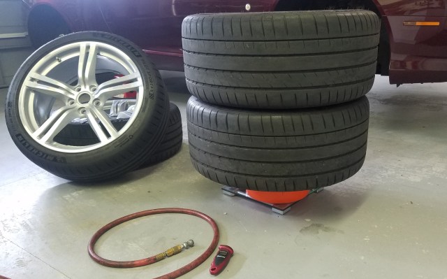 Since I had the scale out, I decided I would weigh the front and rear tire assemblies of the complete Sport Pack wheels with the standard sized but slightly used Michelin Pilot Sport 4S tires, TPMS sensors and filled to the prescribed 36 psi front and 38 psi rear pressures.   The center caps and wheel nuts were NOT included in this total.