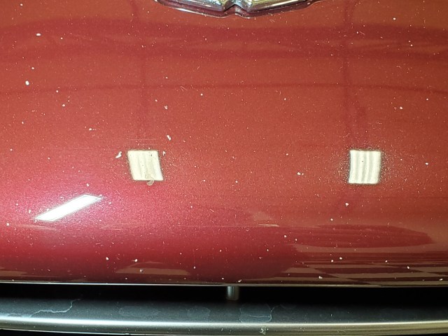 The leading edge of the hood is the upper portion of the grill surround, so it too is directly exposed to road debris.  The area forward of the emblem is particularly nicked.
