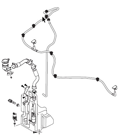 On investigation what sounds simple has a few obstacles; firstly as soon as you look inside the filler cap there is an almost 90° bend; secondly the flexible hose down to the reservoir is corrugated externally and internally which stops a tube being inserted easily; last of all the hose, low down, is routed around other pipes and some wiring. To siphon the screen wash out you firstly have to remove the plastic filler header. The filler header is held in place by 2 nuts (8mm socket) and once these are removed it is then easy to unscrew the flexible pipe that feeds down to the reservoir.