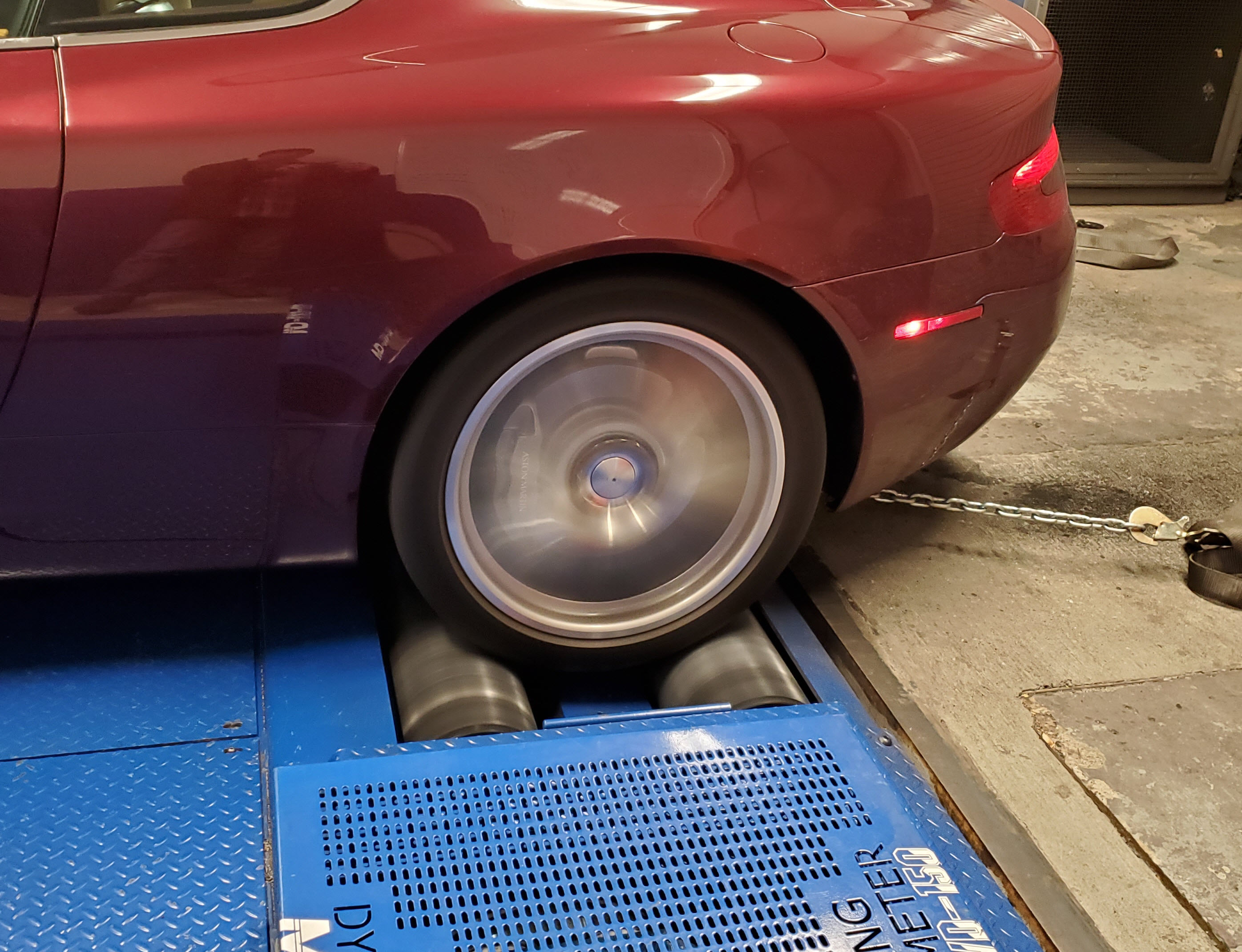 Why aren’t the numbers anywhere near what Aston claims is the engine power and torque in the manuals?   Another good question. We are measuring ‘at the rear wheels’, meaning where the rubber meets the road (literally).  The rear wheels are on rollers, and the rollers are the measuring tool of the Dyno.    Manufacturers published engine power is always of just the engine sitting on a testing stand coupled directly to the Dynamometer.   The difference is all the loss attributed to the drivetrain between the engine and road wheel.   The transmission, the differential, the drive shafts, axle shafts, wheel bearings, brake rotors, etc. all create losses in the system (all the time) and reduce the amounts of power and torque that actually make it to the rear wheels.    There is no way to precisely know how the rear wheel measured numbers relate to the engine power without actually removing the engine and testing it separately.  As a rule of thumb, most people generically quote about 15% power loss through the drivetrain.   If the stock DB9 engine is listed as 450 bhp by the manufacturer, you can roughly expect about 85% or 382 bhp to make it to the road.   From my results showing 367 peak bhp in the baseline run, that would be about 18% power loss through the drivetrain if you believe the engine makes 450 bhp as Aston claimed.  Again, my testing is comparative, so this isn’t that important.