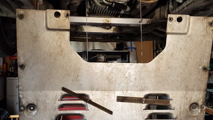 With the undertray bolted in position at the front the next stage is to insert the central bolt through to the main cross-member. Once this is in place the “Third Hand” can be removed and the rest of the bolts fitted.