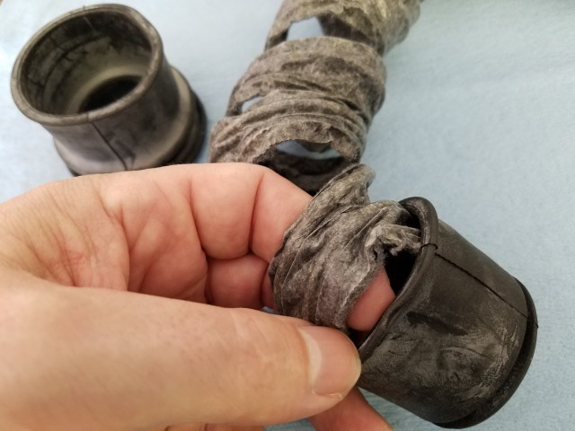 • Grab the rubber fitting on one end of the assembly and gently pull/tug the old hose free from it.  There should be no glue, just a friction fit.