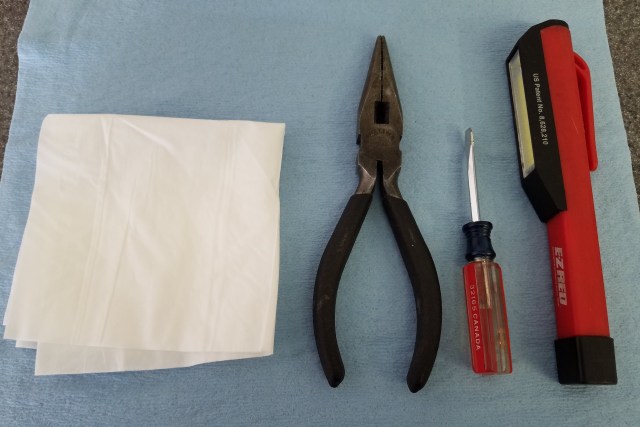 • Crawl back into the foot well with your new hose, inspection light, and small screwdriver.