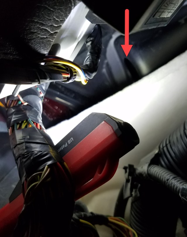 • Roughly poke the remaining end out the dash hole, and now you can crawl out from the foot well.  You’re back will be happy.