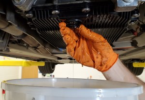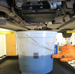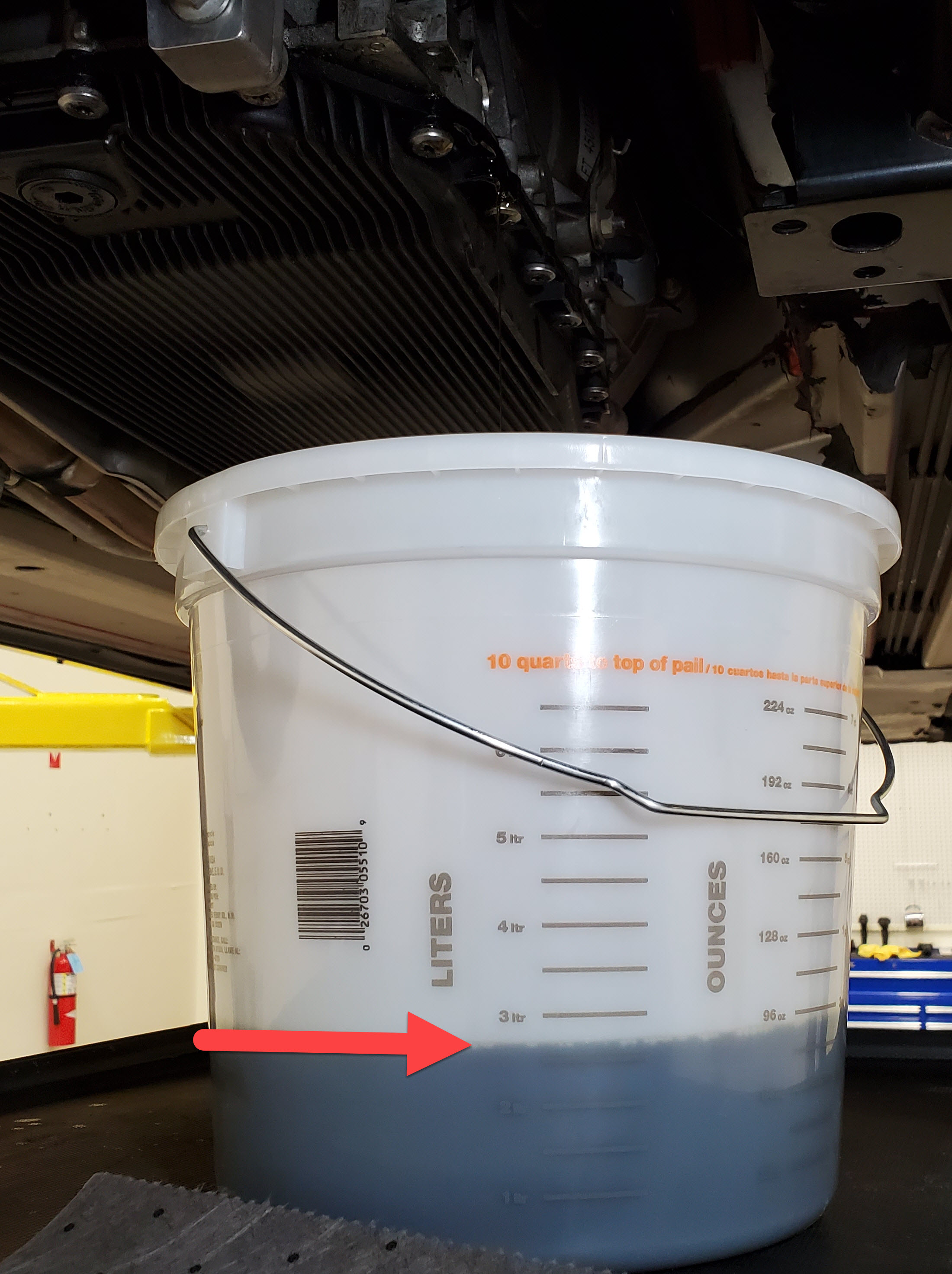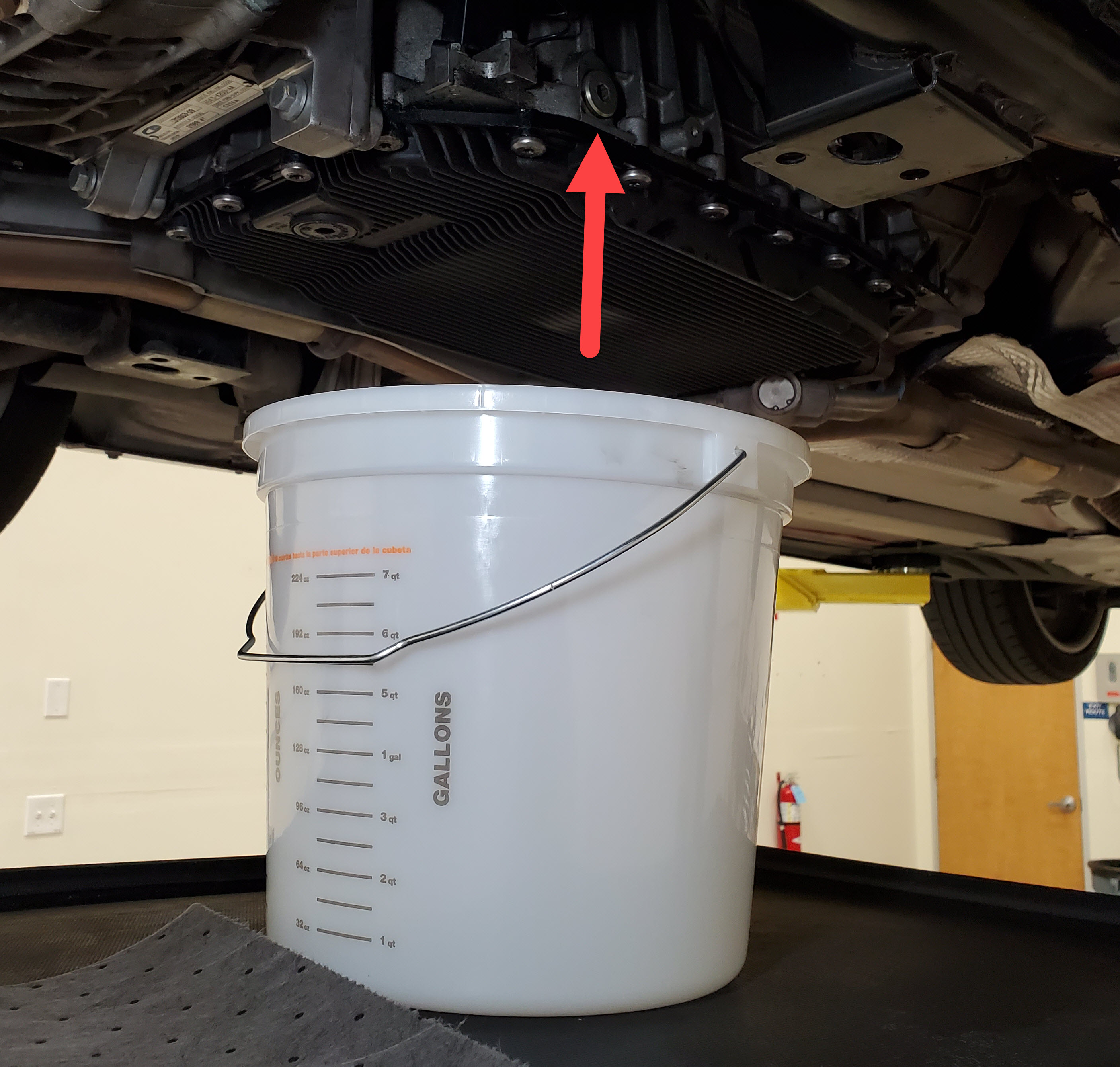 - Once the fill plug is loose, position your drip tray and bucket and fully remove the fill plug to drain the initial whack of fluid. You will get about 2.5 liters.