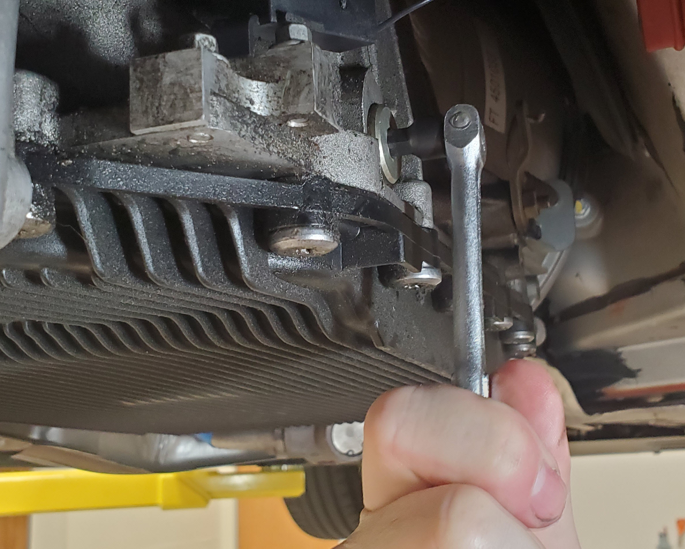 - Use the stubby 8mm wrench and crack loose the transmission fluid FILL plug.