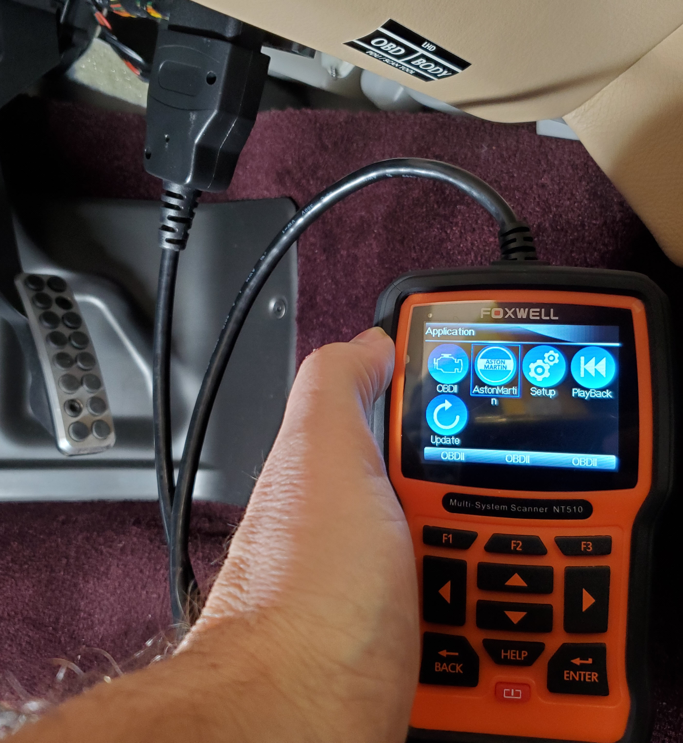 Unlike most of my articles, this is one where you will need a specialty tool to do the job properly.   You need an OBDII Diagnostic Tool that is smart enough to talk to the Transmission Control Module and retrieve the real time transmission fluid temperature.  In other articles I’ve written about these extensively, and the one that I recommend you have in your toolkit is the very affordable Foxwell Technologies unit like this model NT510.   It has the smarts to talk to most all of the computer control modules in the Aston, and this is exactly what we need during this process.   You can find out more about the Foxwell (including costs and where to purchase) here in this article.