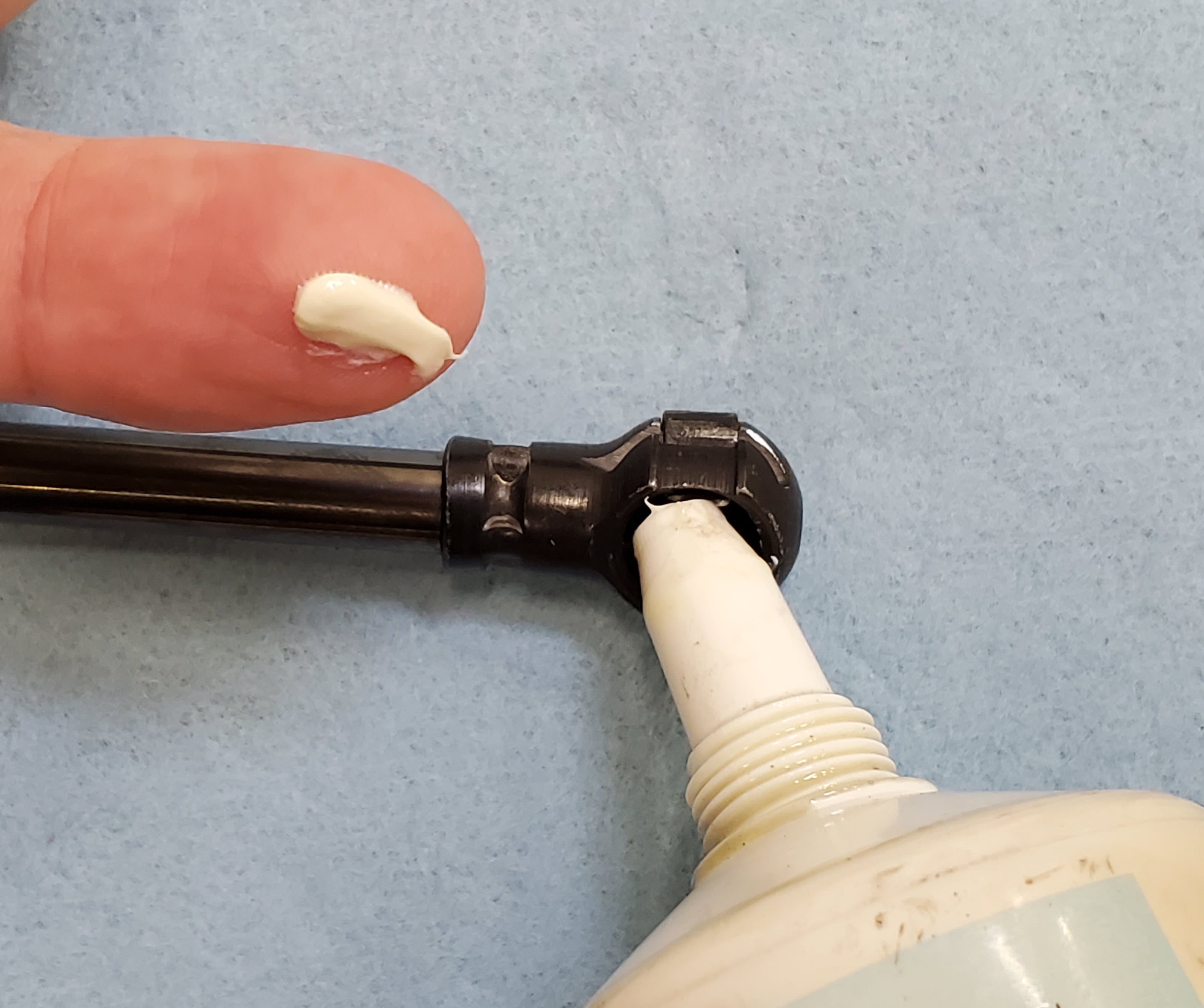 The socket mounts over a ball, and the two things pivot under load. Having some lubricant (grease) in the socket will help. Inspect your new struts to see if there is a ‘dab’ [official measure] of grease in the socket already. If not, I’d suggest you put a dab of White Lithium grease in the socket. No need to spread it around, it will distribute as the ball inserts.