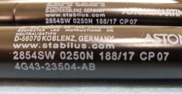 Gas struts are very popular and its no surprise Aston didn’t make a bespoke strut but rather outsourced the struts to a German company Stabilus. You can see it right on the labelling.