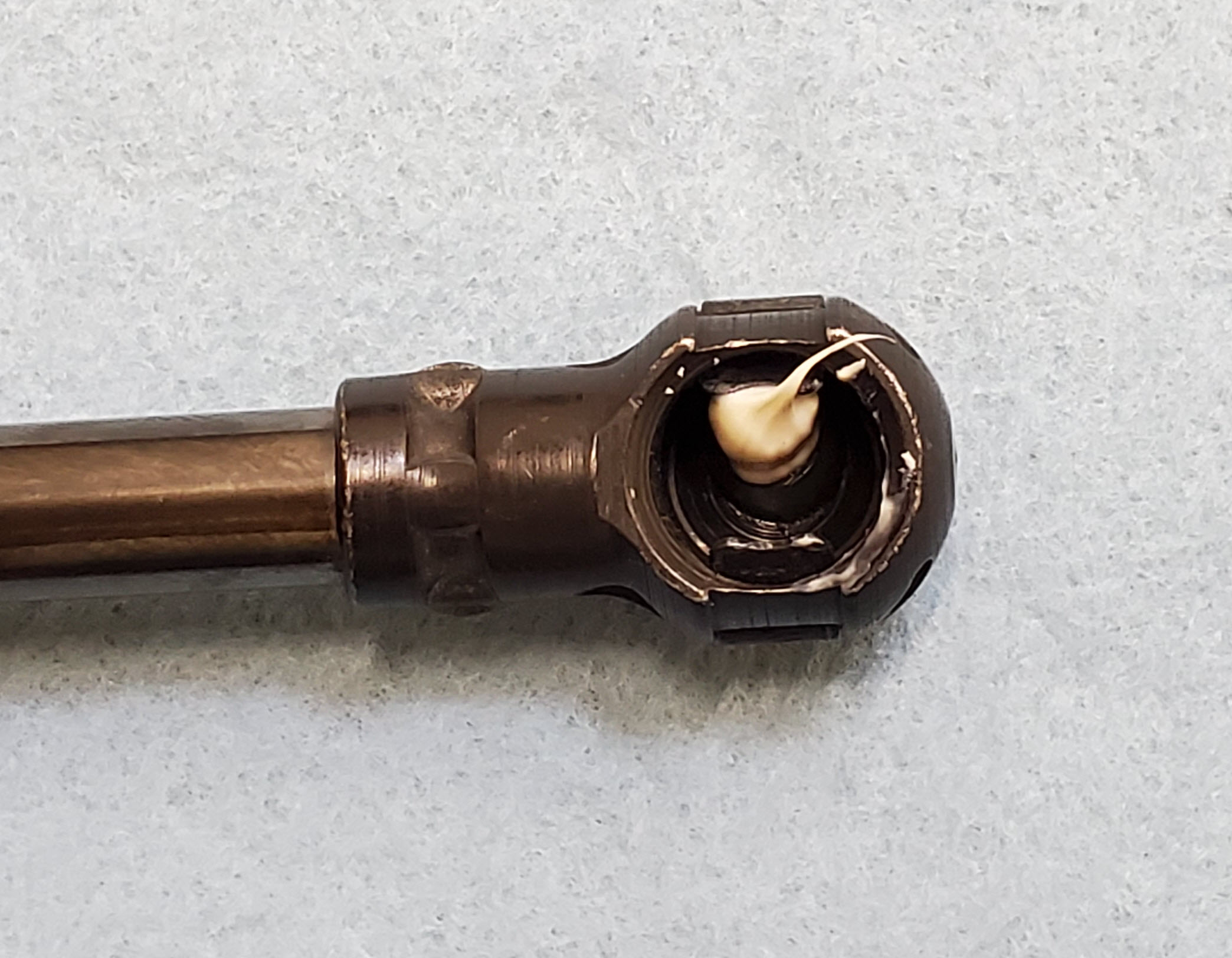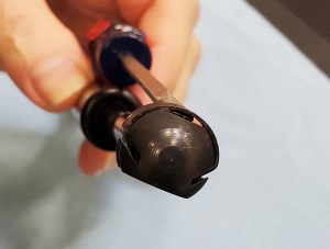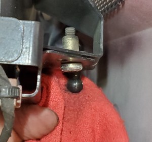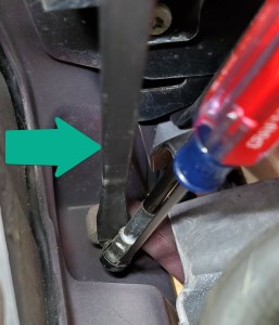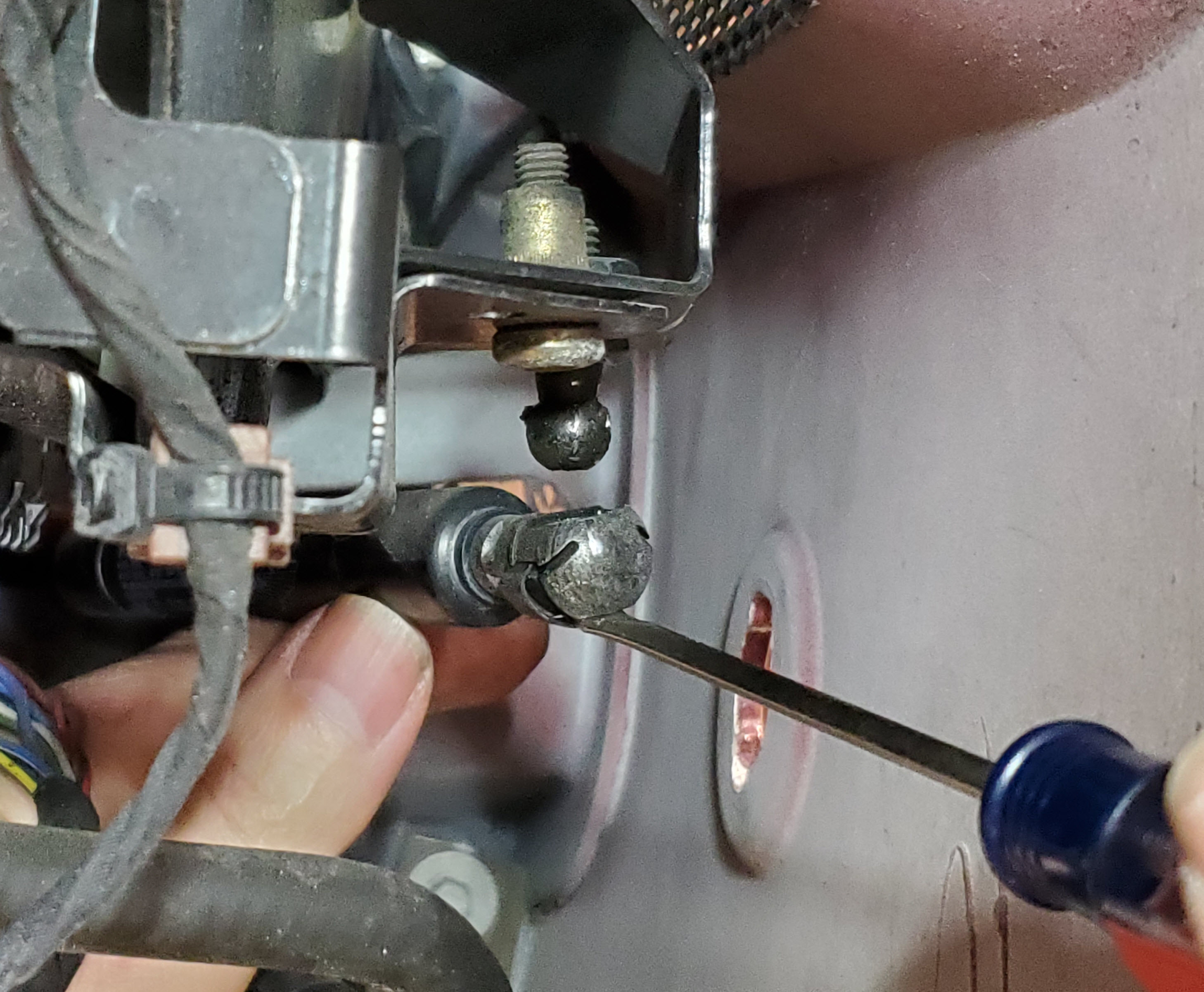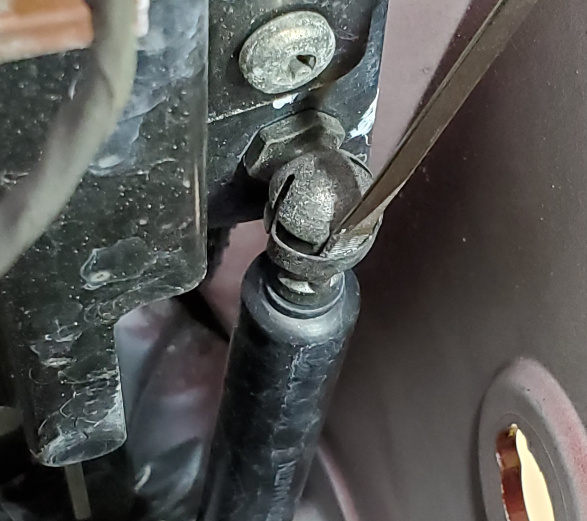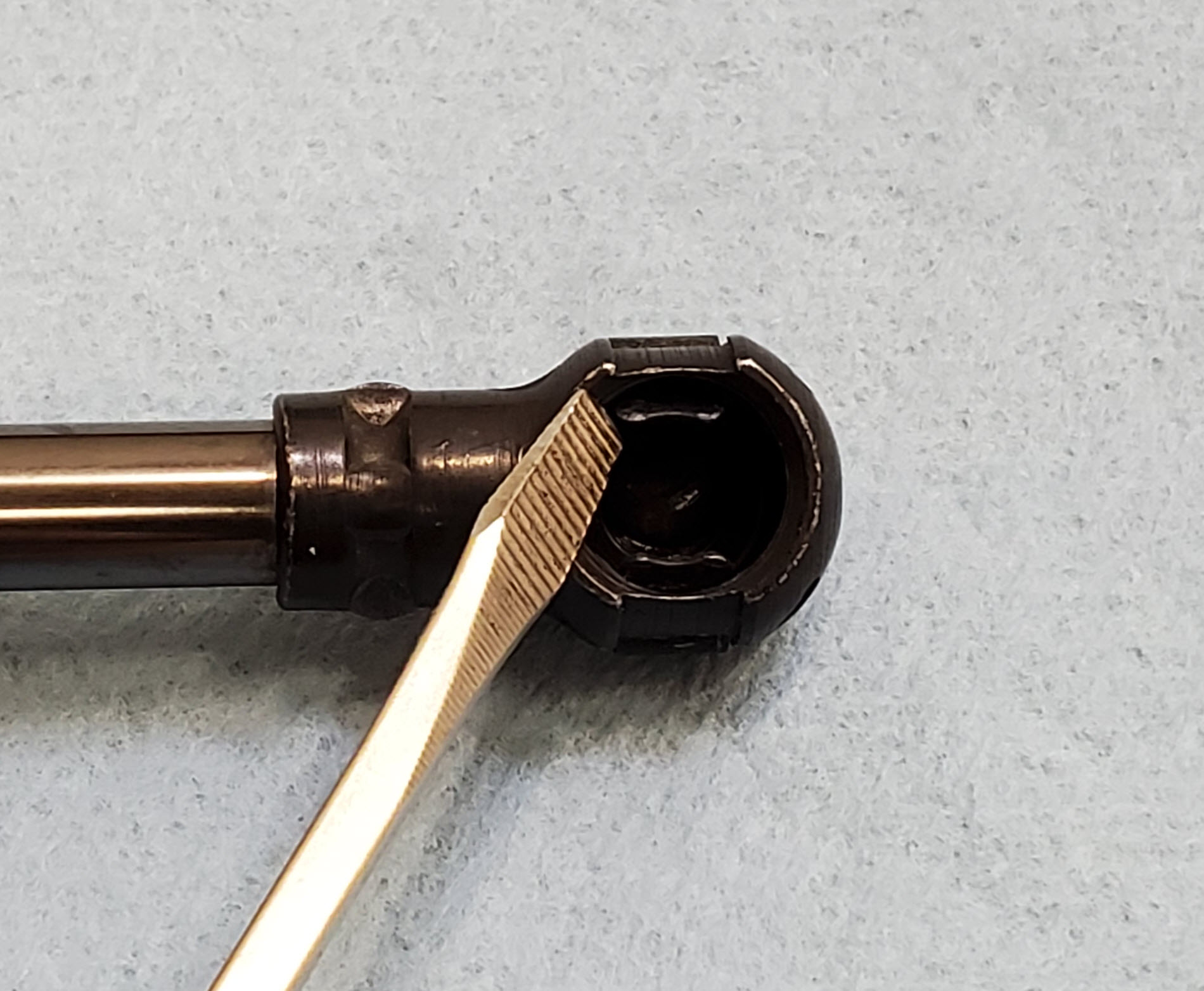 You don’t need to remove the clip entirely to release it. Doing that would create a problem actually, the clip is a witch to get reinstalled if you accidentally pop it all the way out. To release the socket so it can slip off the ball you only need to retract the clip a small amount. Do this by slipping a small flat blade screwdriver in the slot on the head of the socket (see photo). I strongly suggest you fiddle with this on the bench for a minute before trying it on the car. Figure out how it works.