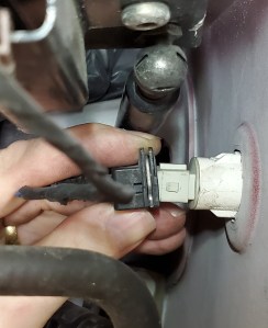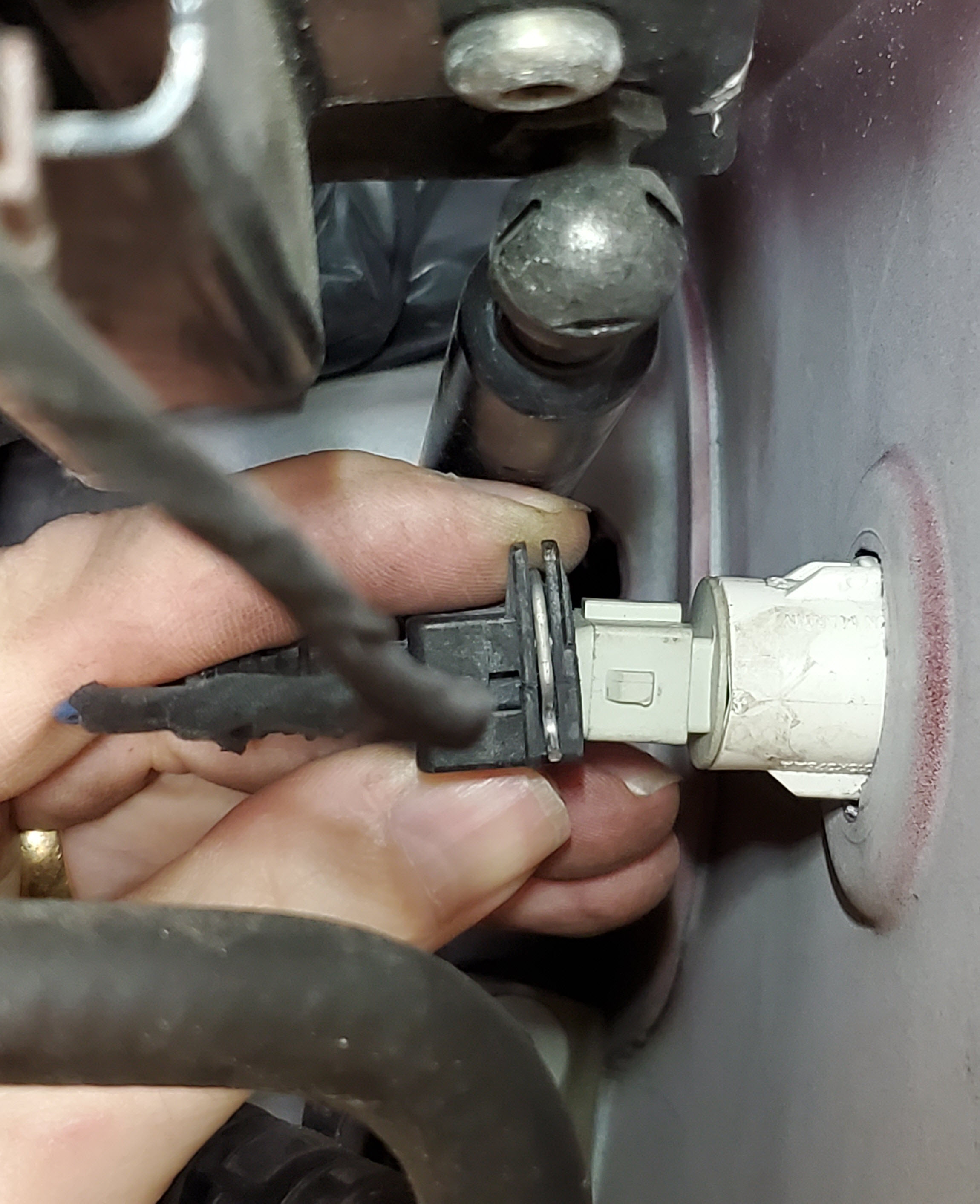 - Disconnect the electrical connection by pressing the wire bar on the back of it. Should press in easily. Pull off the connector. See the video below to make this easier to understand.
