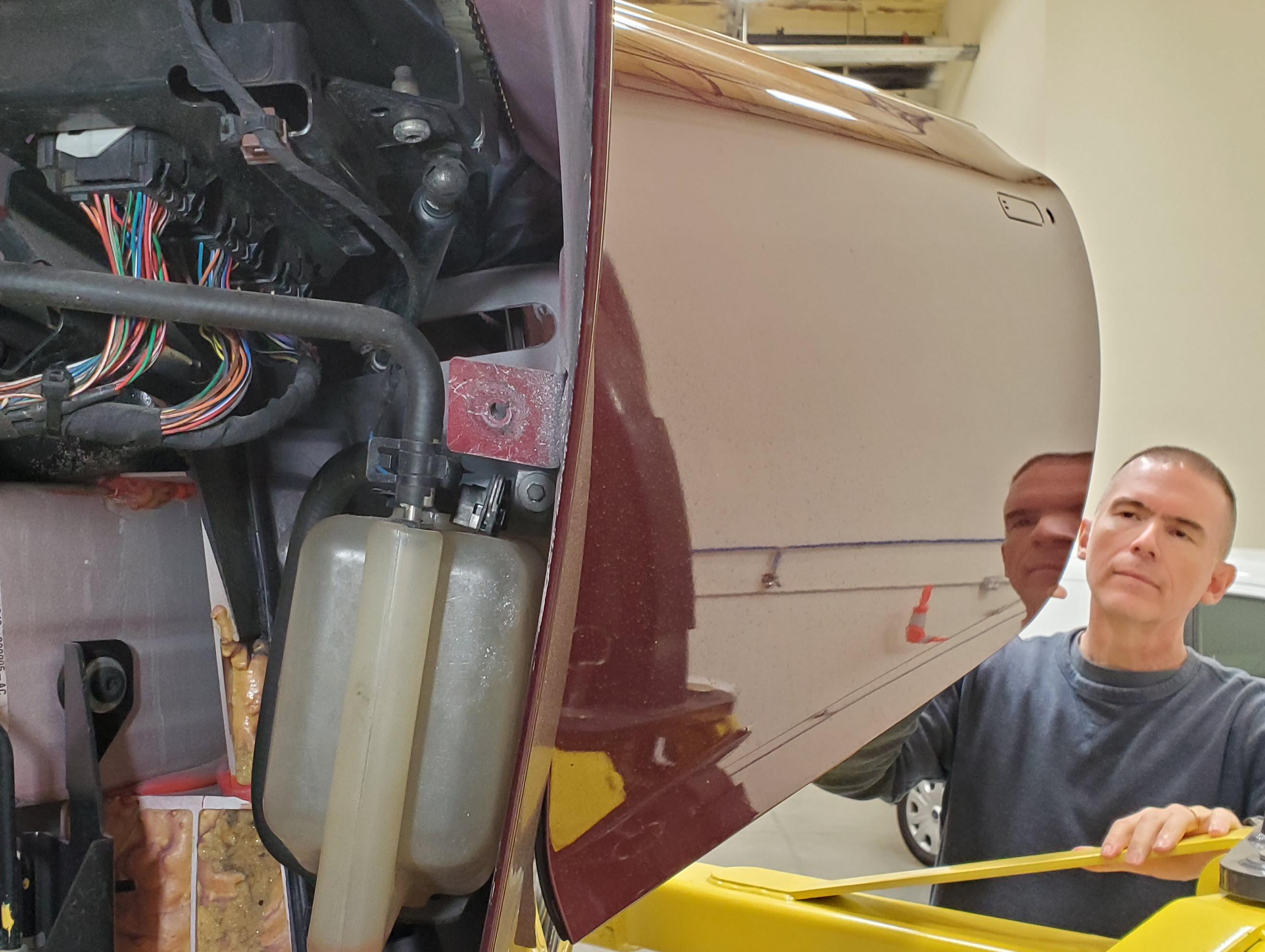 - NOTE: Make sure the helper is stabilizing the door, and not just leaning on the door to keep it open. Once the strut is released, the door can now OVER open, and you don’t want to accidentally kink it into the fender, etc. Just have them stand at the end of the door and hold it where it is full open.