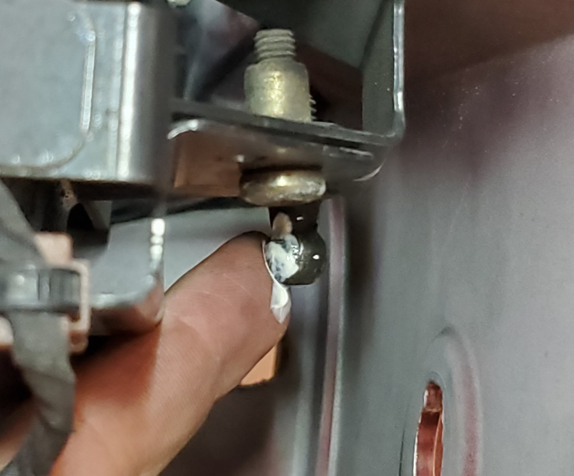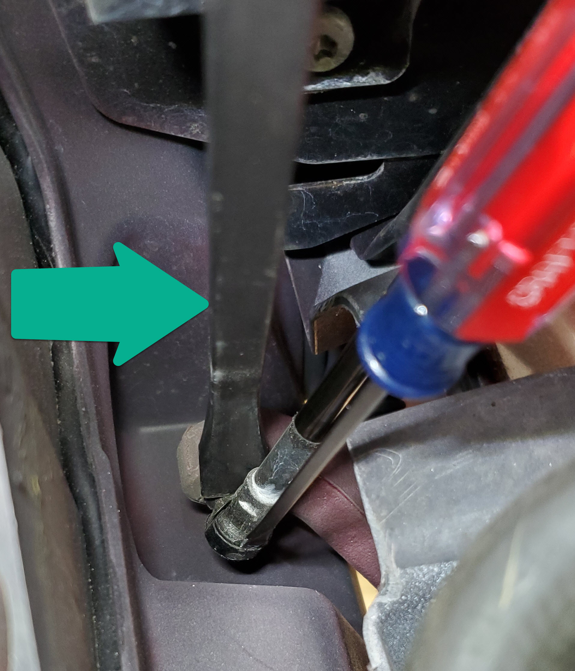 - Have a look around to orient yourself. The near end of the strut is easy to see. The FAR end of the strut is barely visible through a slot in the rear of the fender area. I’d suggest you have your helper slowly open and close the door as you watch the far end. You’ll see it move laterally back and forth. Note that at Full Open the head of the strut appears at the end of the slotted area, and we have the best access to it. Not great access, but enough. Check out my video below to see what I mean.
