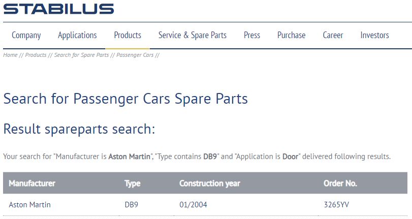 I had a solid look around the Stabilus website thinking I could potentially bypass Aston for the purchase, but I wanted to be 100% certain of the part number and spec’s of the strut before I went this route. Stabilus has a ‘Spare Part’ lookup tool, and it included the Aston Martin DB9 Coupe Door gas struts. It’s their part 3265YV.