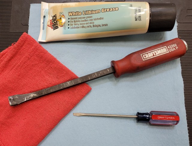 One very important tool not in the picture is a HELPER. You need someone or something to hold door wide open while you change the strut. You’ll see me use a camera tripod and do it solo, but if you can entice your Sweetie or friend to help you for 10 mins it will be even easier.