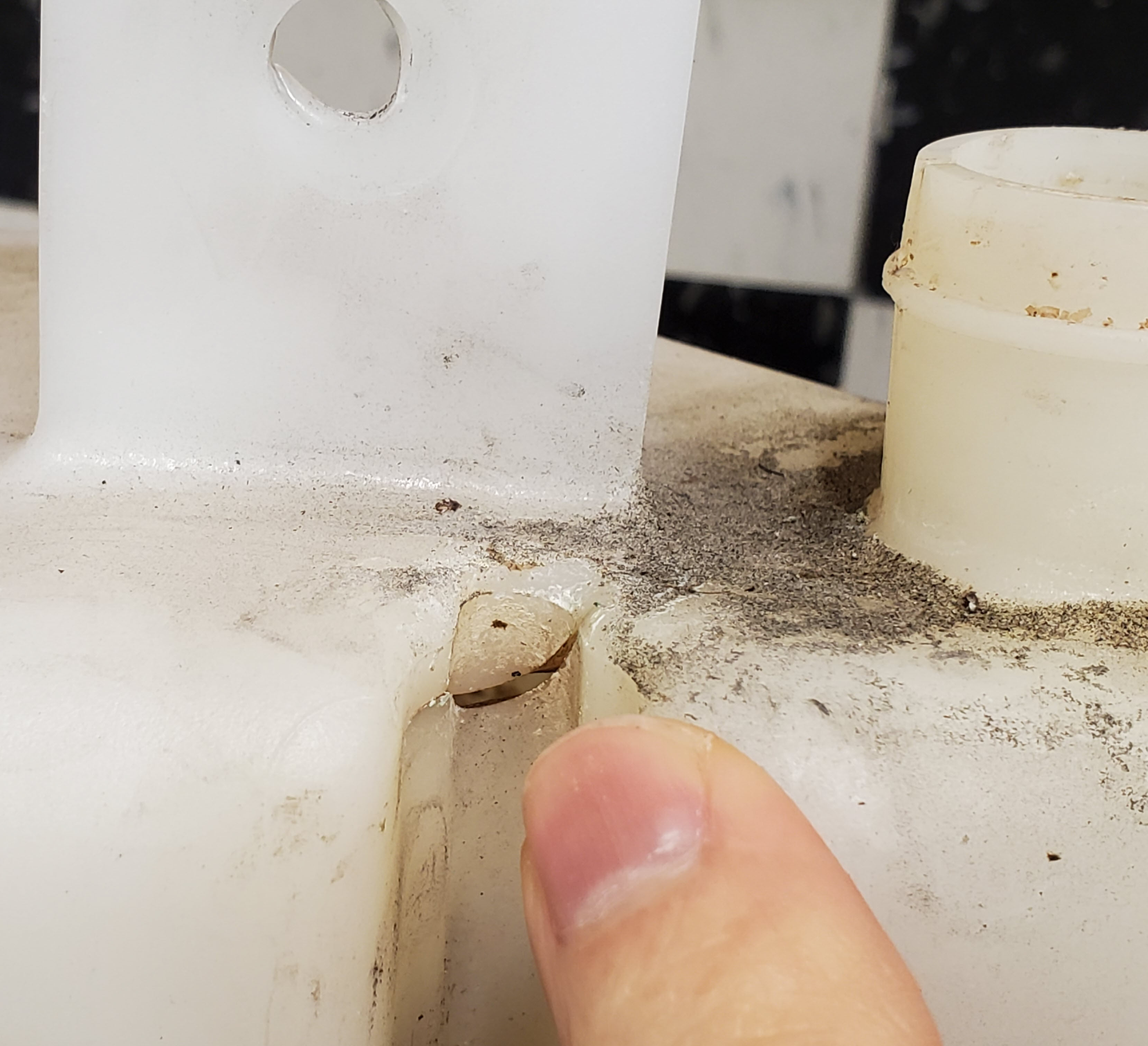 In 2014 I spotted this crack near the top of the tank below the filler neck. As you are blindly topping up the fluid during a service you have no idea your full until the water comes up the filler tube and is near the cap. At that point all the water in the neck and top inch or so of the tank would now drool out on my foot.