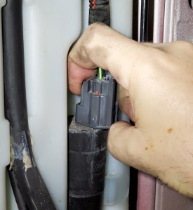 • Press on the connector tab and wiggle the connector off. I ended up using a small flat blade screwdriver and inserting it at this point to press directly on the release tabs. Worked much better than just squeezing it with my fingers.  Check out the video below to see how I used the screwdriver with the tabs.