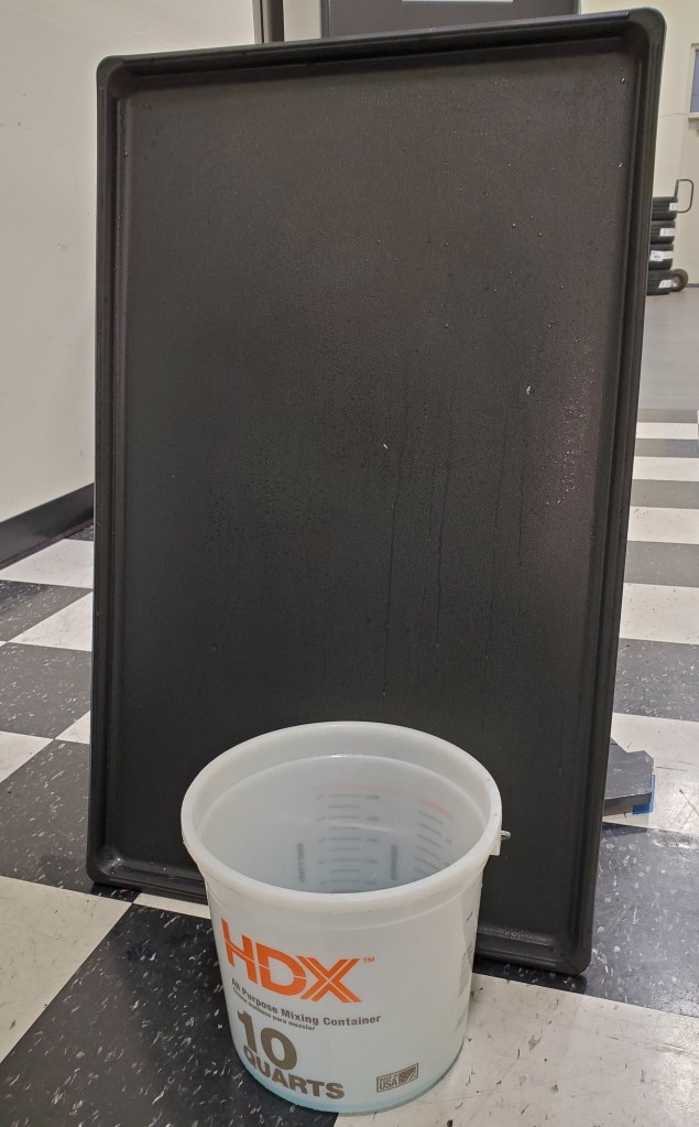 • I purchased a dog kennel plastic tray/liner that was perfect for the task.  One that was 35″ x 22″ was only $16 USD on Amazon with free shipping