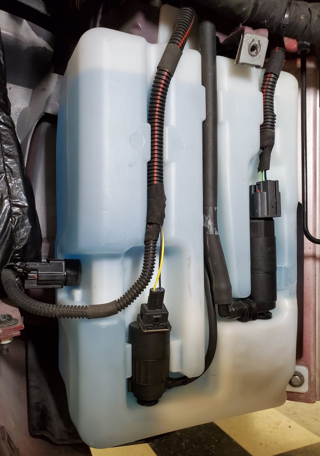 The tank has three items of interest mounted to it. It has one pump for the windscreen sprayers. It has another pump for the headlight sprayers. And it has an electronic level sensor to detect when the fluid level is down to about 1/3rd of the tank. The tank itself holds nearly 10 liters of washer fluid (wow).