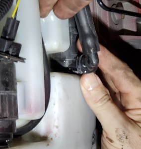 • Wiggle the hose up and off the filler neck until it just clears. I just pushed it up easily.