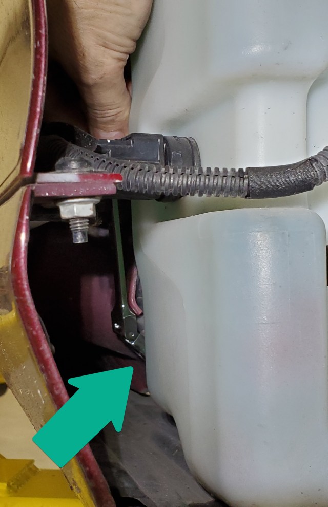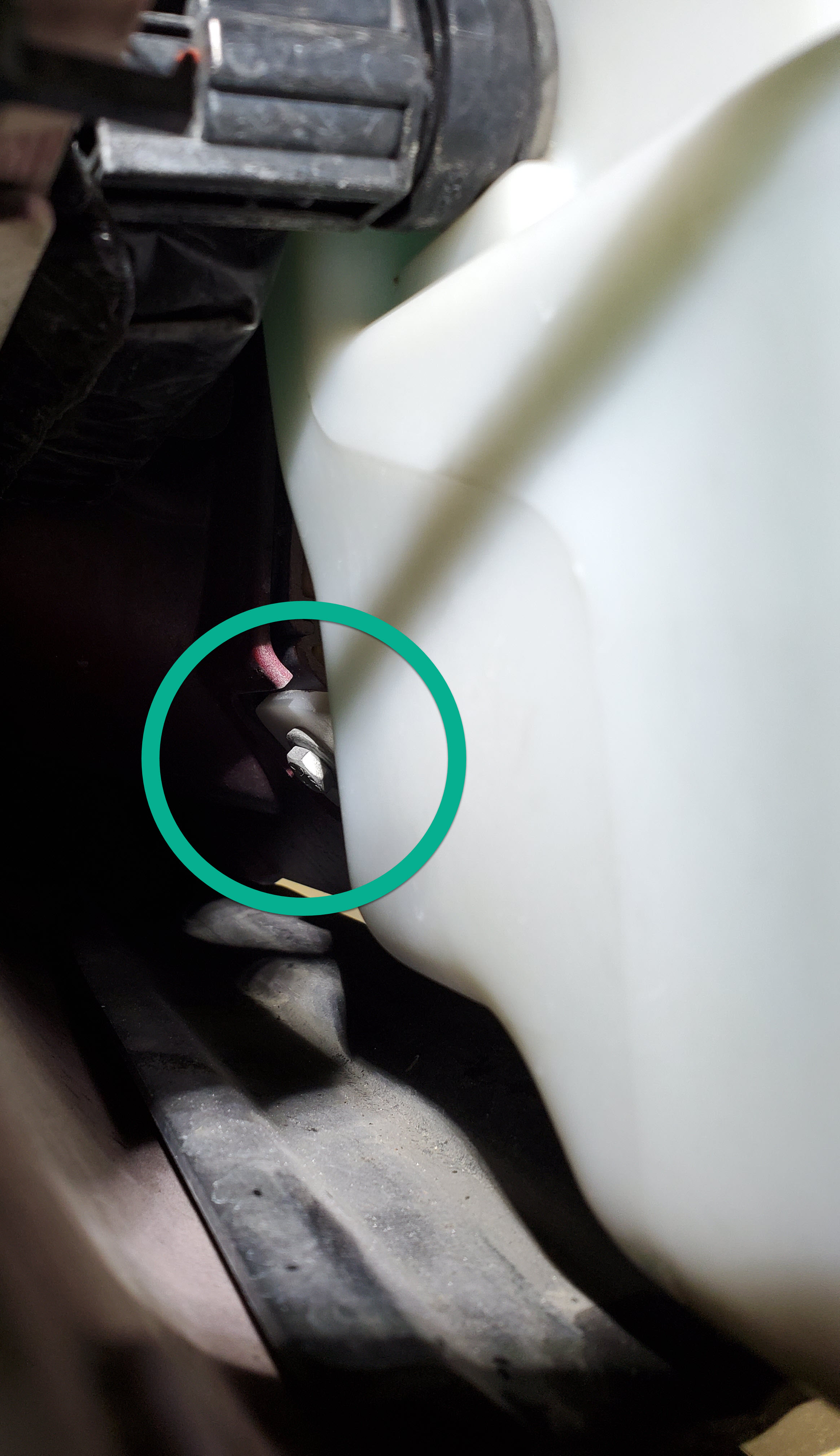 The plastic tank is hidden in the right front wheel well. You’ll need to get access to this area to do the work. I’ve created other articles on these steps to get in there: