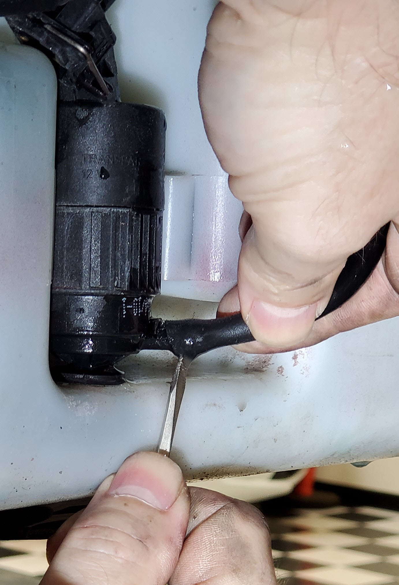 Hop in the car and try your washer sprayers. It may take several applications to get the pump and lines to fill with fluid and start spraying. You want to make sure everything is spraying fluid now so you can be sure the new pumps work, the hoses are connected and the sprayers aren’t plugged. And now leak three: