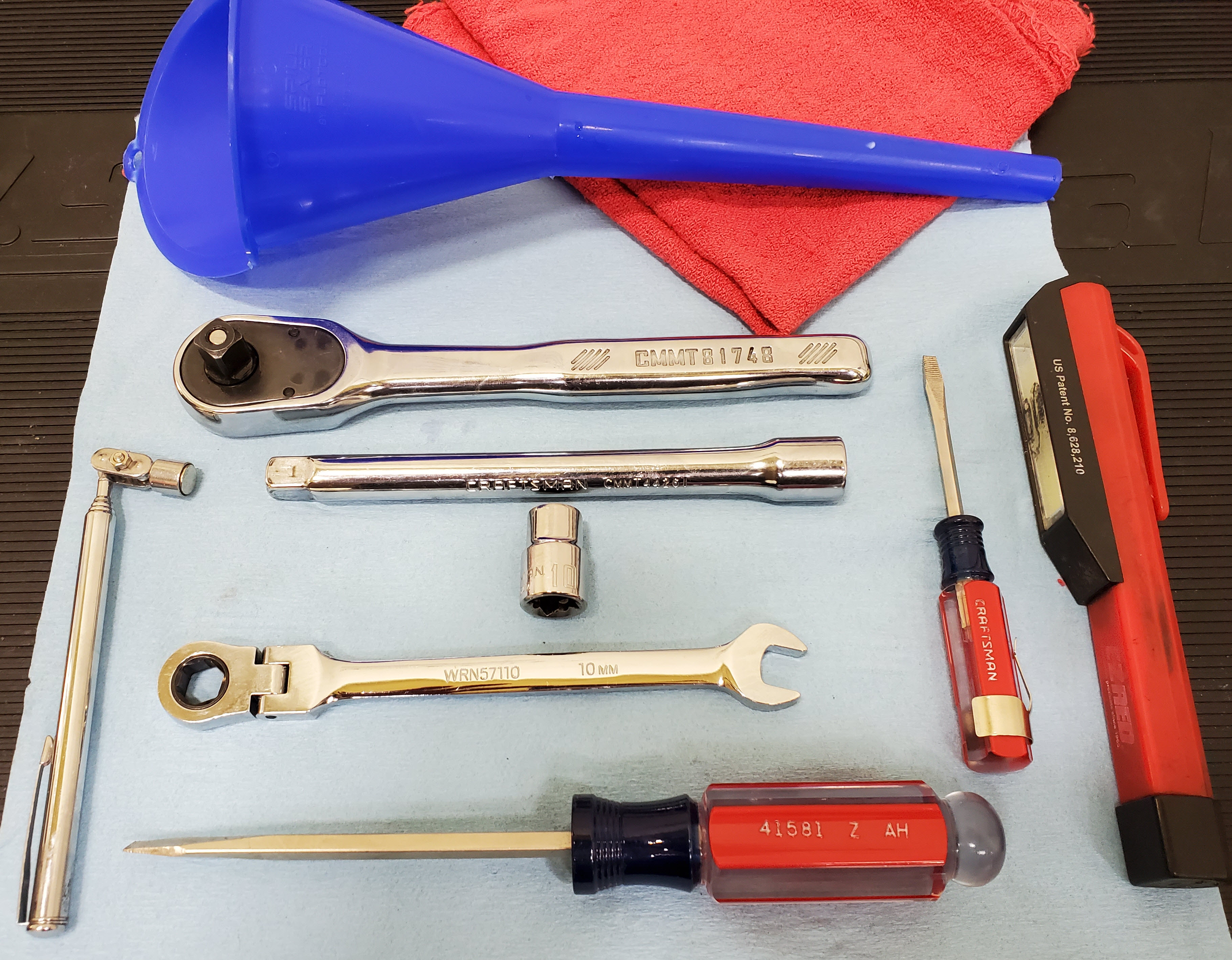 • 10 mm bendy ratcheting combination wrench. The bendy bit, and ratcheting bit are both essential for this task. I don’t think I could have managed it without both features.