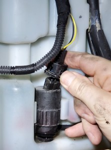 • Reconnect the electrical connector to the headlight washer pump. It should click when fully seated.